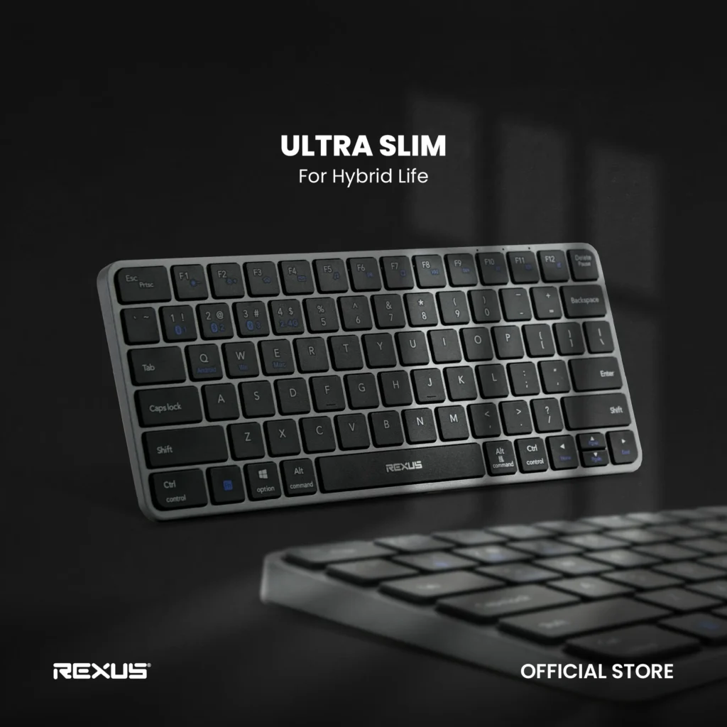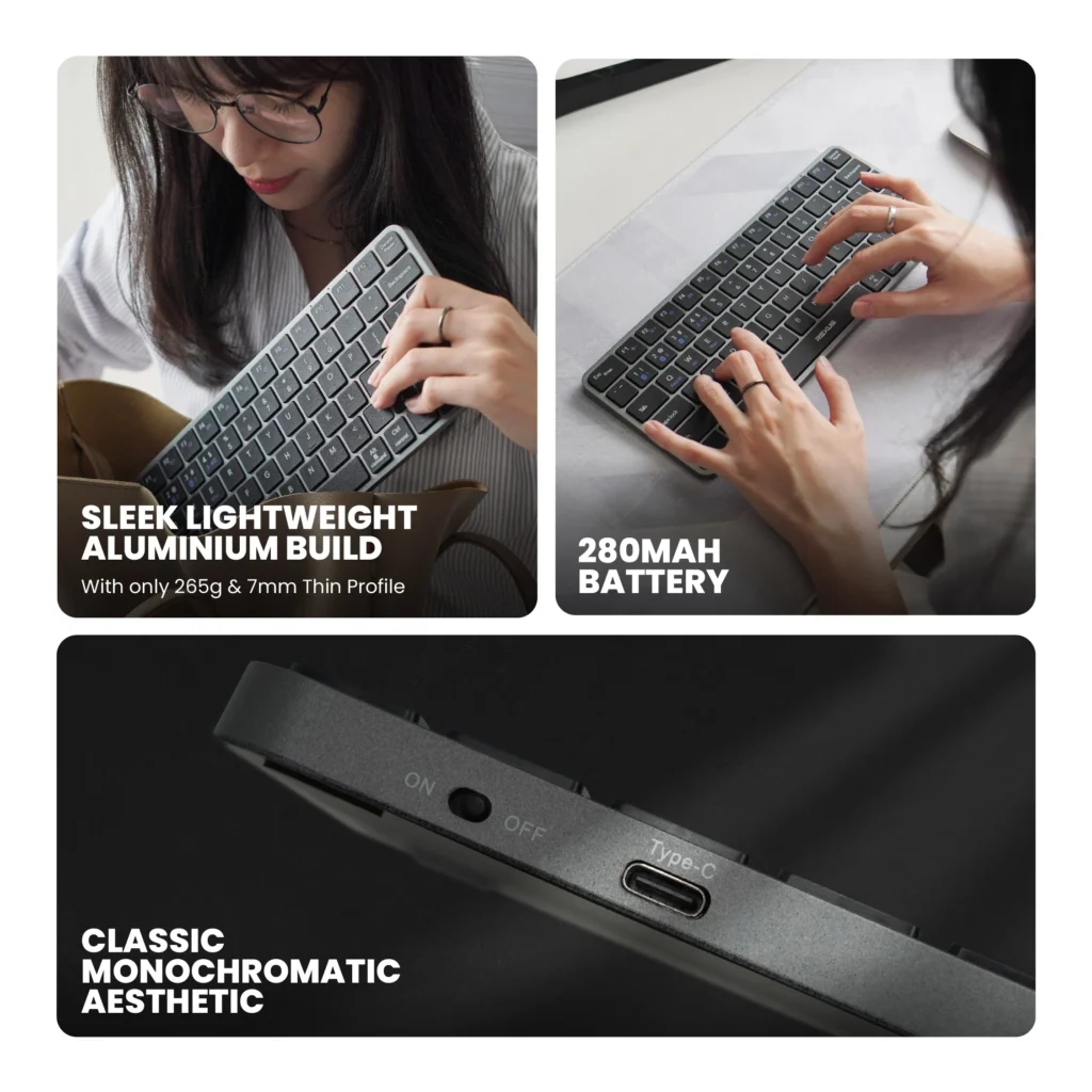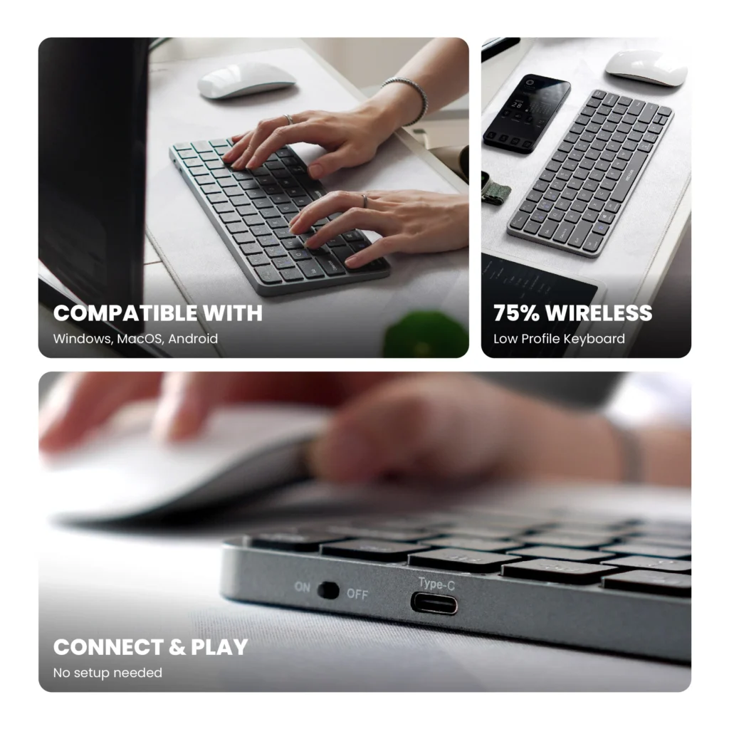 Keyboard ini juga ultra slim dengan desain yang hemat tempat. Kamu bisa menggunakannya baik di kantor maupun secara remote, bahkan bisa bergantian menggunakan koneksi dongle wireless 2,4 G atau Bluetooth. Konstruksi aluminium elegan yang ringan hanya 265 g dengan ketebalan 7 mm. Dengan layout 75% wireless low-profile, keyboard ini compact namun tetap fungsional, menghemat ruang kerja dan memaksimalkan fokus.