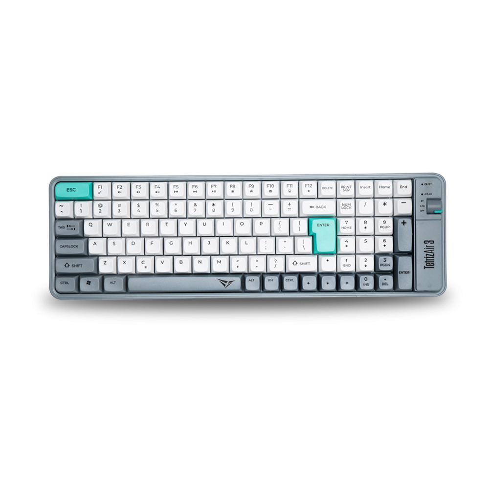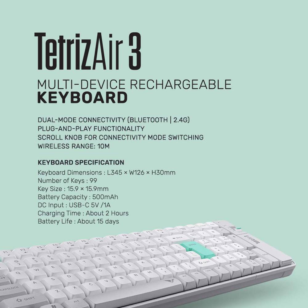 Alcatroz Tetriz Air 3 menjadi salah satu pilihan keyboard nirkabel yang cocok. Keyboard ini mendukung Bluetooth 5.3 dan Wireless 2,4 G. Dilengkapi dengan baterai rechargeable, kamu tidak perlu sering mengganti baterai. Dengan 99 Key Compact Size, keyboard ini tetap ringkas dan Ergonomic Design-nya membantu mengurangi kelelahan tangan. Keyboard ini juga memiliki Inclination Adjustable Bracket serta Scroll Knob Connectivity Switching yang memudahkan kamu berpindah antara koneksi perangkat.